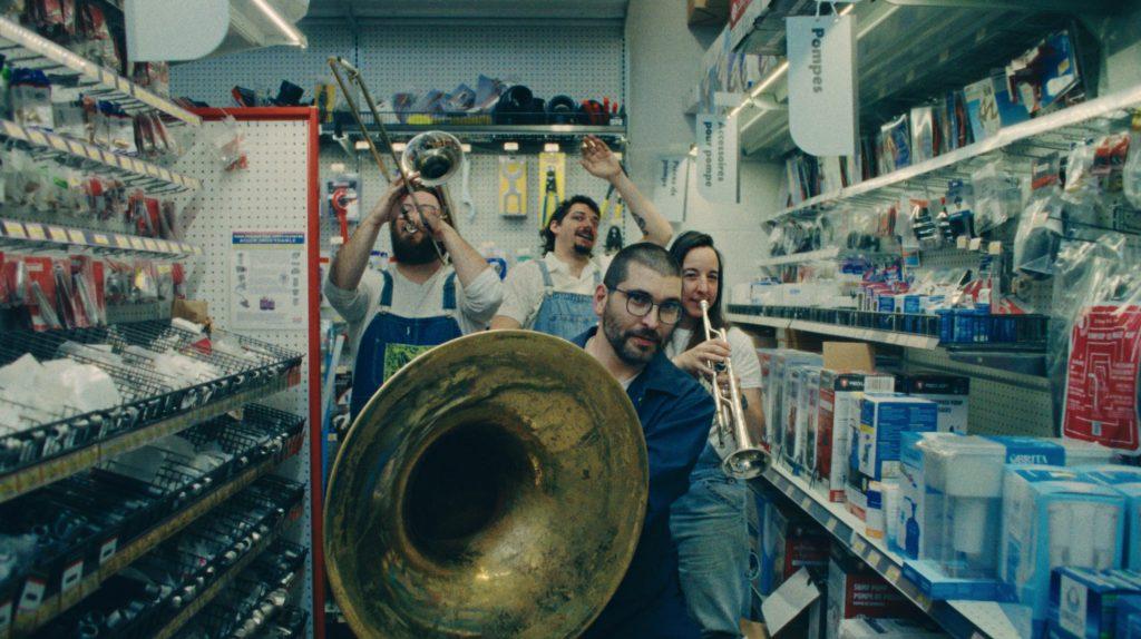 Vincent Beaulieu (batterie), Étienne Leclerc (trombone), Elisabeth Besozzi (trompette) et Nicolas Quaegebeur (sousaphone).